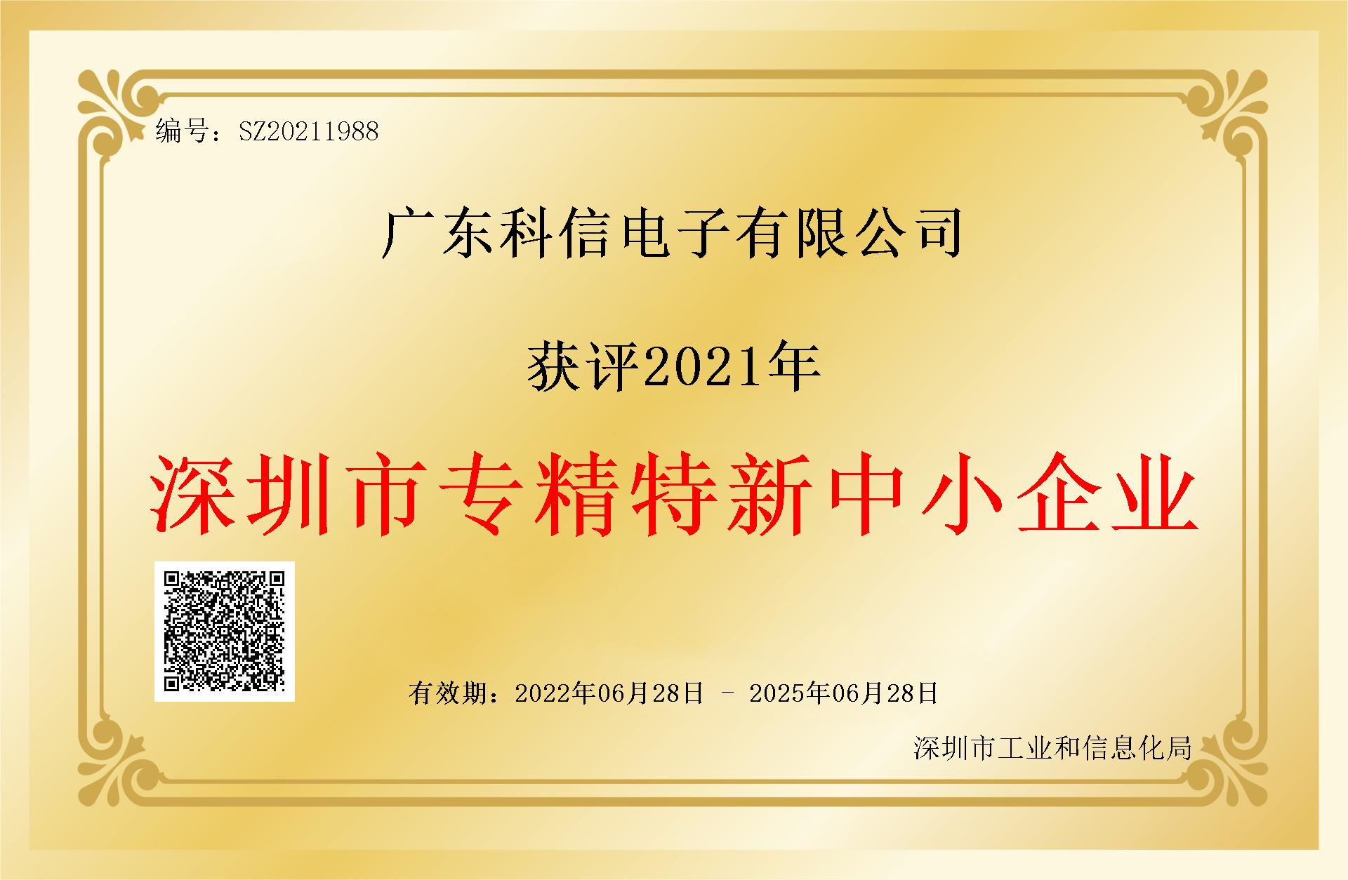 ? ?廣東科信電子有限公司獲評2021年“深圳市專精特新中小企業”認證。這是公司獲得國家高新企業認證后,對科信電子發展成就的再次肯定,“專精特新”企業是未來產業鏈的重要支撐,是強鏈補鏈的主力軍。科信電子將不斷提高公司在行業內的核心競爭力及影響力,持續打造“我們專業,因為我們專心”的專業平臺。